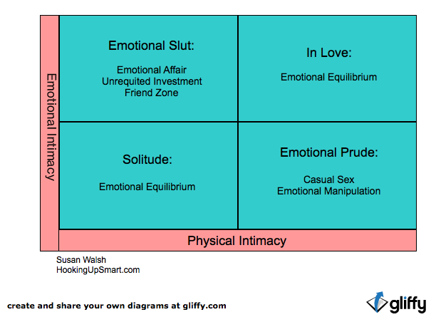 Ideally, emotional and physical intimacy are in balance. For most people, both emotionally slutty behavior (strong emotional intimacy without sex) and emotionally prudish behavior (powerful physical intimacy without emotion) may be said to describe a state of disequilibrium: